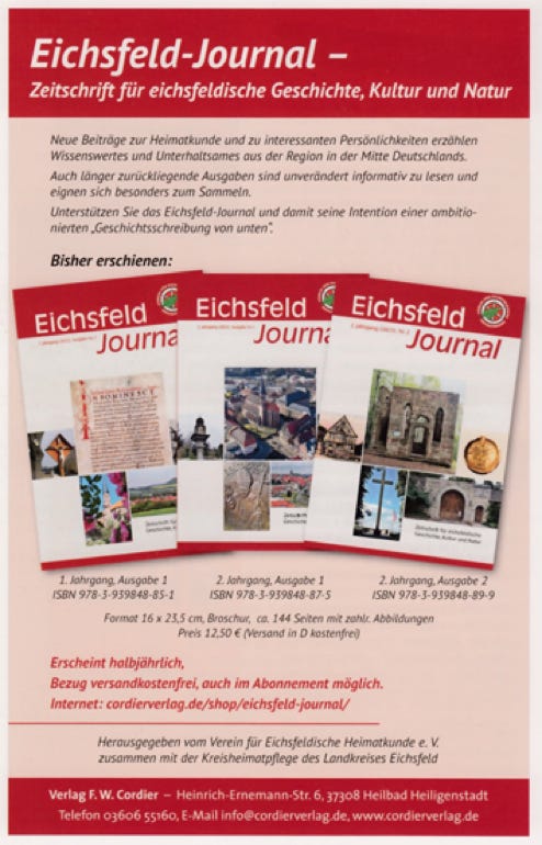 Eine weitere Publikationsreihe ist das seit 2022 herausgegebene Eichsfeld-Journal, die Zeitschrift für eichsfeldische Geschichte, Kultur und Natur. Sie erscheint im Cordier Verlag, Heiligenstadt, und kann dort abonniert werden.